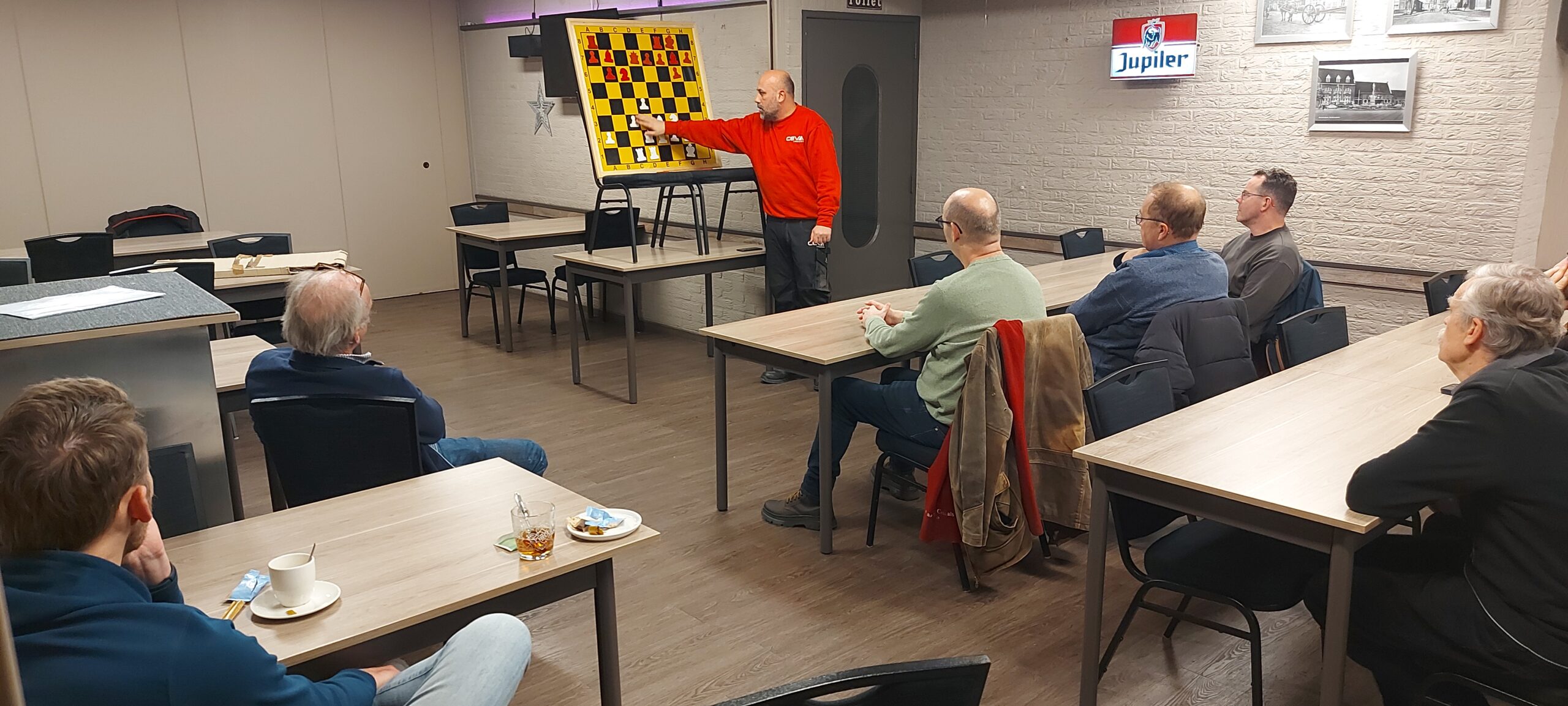 Met een tweede volwassenen training verzorgt door Aleksandar Trailovic begon gisteren de laatste clubavond van het (kalender)jaar 2025. De komst van Aleksandar was in de What’s App groepen van onze club aangekondigd en het aantal aanwezigen was dan ook een stuk hoger dan bij een reguliere volwassen training. We begonnen met ongeveer twaalf aanwezigen. Goed om te zien dat onze leden zijn verhalen op prijs stellen! Voor deze gelegenheid had Aleksandar iets voorbereid over twee partijen van een week eerder tijdens de externe competitiewedstrijd ZSC 1 – De Pion 1. De ene partij was van Ivo Kok (met wit) en de andere partij was van Aleksandar zelf (met zwart). Maar het bijzondere aan deze twee partijen is dat ze tot een zet of tien identiek waren. De zetten werden besproken maar niet alleen dat. Ook de gedachten die dan als speler door je hoofd gaan werden gisteren uitvoerig besproken. Wat doe je in zo’n situatie…. wachten op de zet van de tegenstander van Ivo of zelf net sneller een zet doen. Afwachten en alvast nadenken over hoe je gaat afwijken of dan toch nog even dezelfde zet spelen. Al met al was het dankzij Aleksandar weer een zeer interessante en geslaagde training!