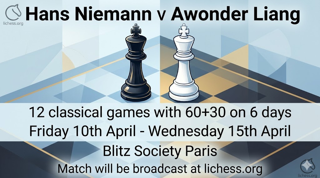 By Frans Peeters • 10 april 2026De komende zes dagen ben ik arbiter en DGT operator van een match tussen GM Hans Niemann en GM Awonder Liang in Parijs. Twee jaar geleden speelde Hans Niemann drie matches waar ik ook arbiter was, namelijk tegen Anish Giri in Utrecht, Vitiukov in Londen en Bacro in Parijs. Toen waren het klassieke partijen, rapid en blitz maar deze keer gaat het enkel om 12 klassieke partijen op 6 dagen met een speeltempo van 60 minuten en een increment van 30 seconden. Dat tempo geldt eigenlijk niet voor klassieke partijen bij spelers met een rating boven de 2700 maar de FIDE heeft dit jaar een pilot om te onderzoeken of dit speeltempo geschikt is. Op het Tata vroeg Hans of ik weer arbiter wilde zijn en daar had ik wel oren naar. Er moest wel een speciale aanvraag ingediend worden die een paar keer heen en weer ging tussen de FIDE en mij. Je moet uitgebreid motiveren waarom je met dit tempo wil spelen.